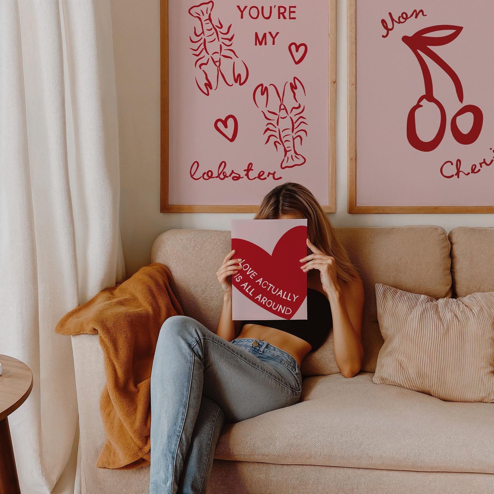 Love Actually Is All Around Poster, Red Heart Wall Art, Retro Illustration Poster, Print for Bedroom, Valentine's Print